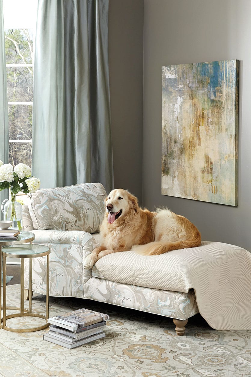 BW: Not everyone loves your dog as much as you do. If you let your dogs jump all over the sofas, no one will feel comfortable coming over and sitting down. I like to wrap the cushions of my sofa in different fabrics for the dogs, but I want them to look good. I hate seeing someone just throwing a sheet over the chair. This blanket is great, because it’s attractive and it tucks into the cushions easily. If your dog wants to jump up on it, fine. You can throw it into the wash. I call it a pet blanket, but I would put it at the foot of my bed any day, because it’s nice to have a lightweight blanket that you can pull over you when you want to take a nap. So it’s not just for pets.