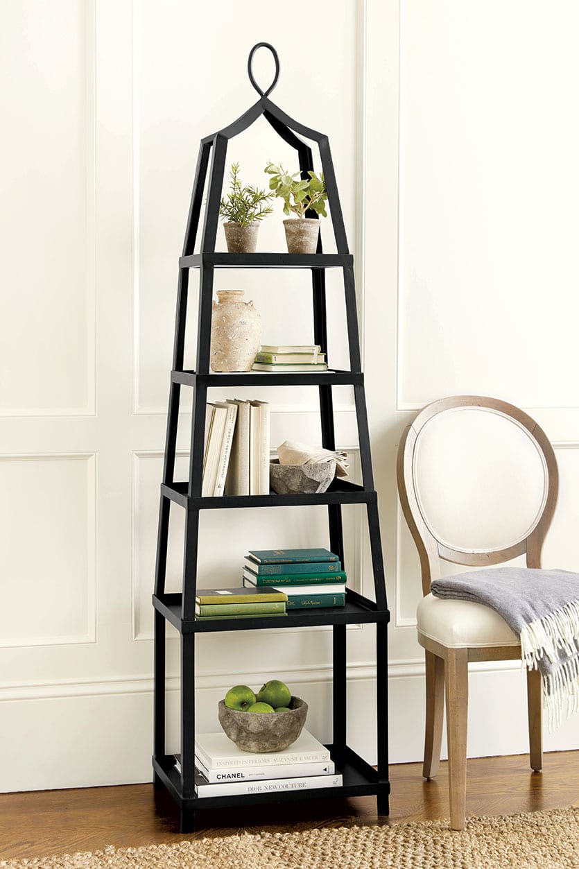 A piece of furniture with open shelves for displaying decorative objects and other small items. A common mispronunciation is: eh-tah-zhair.