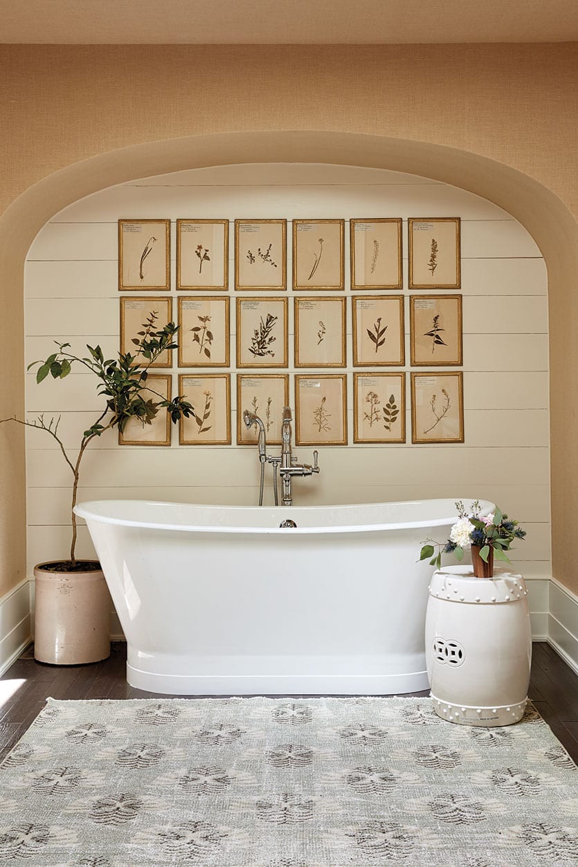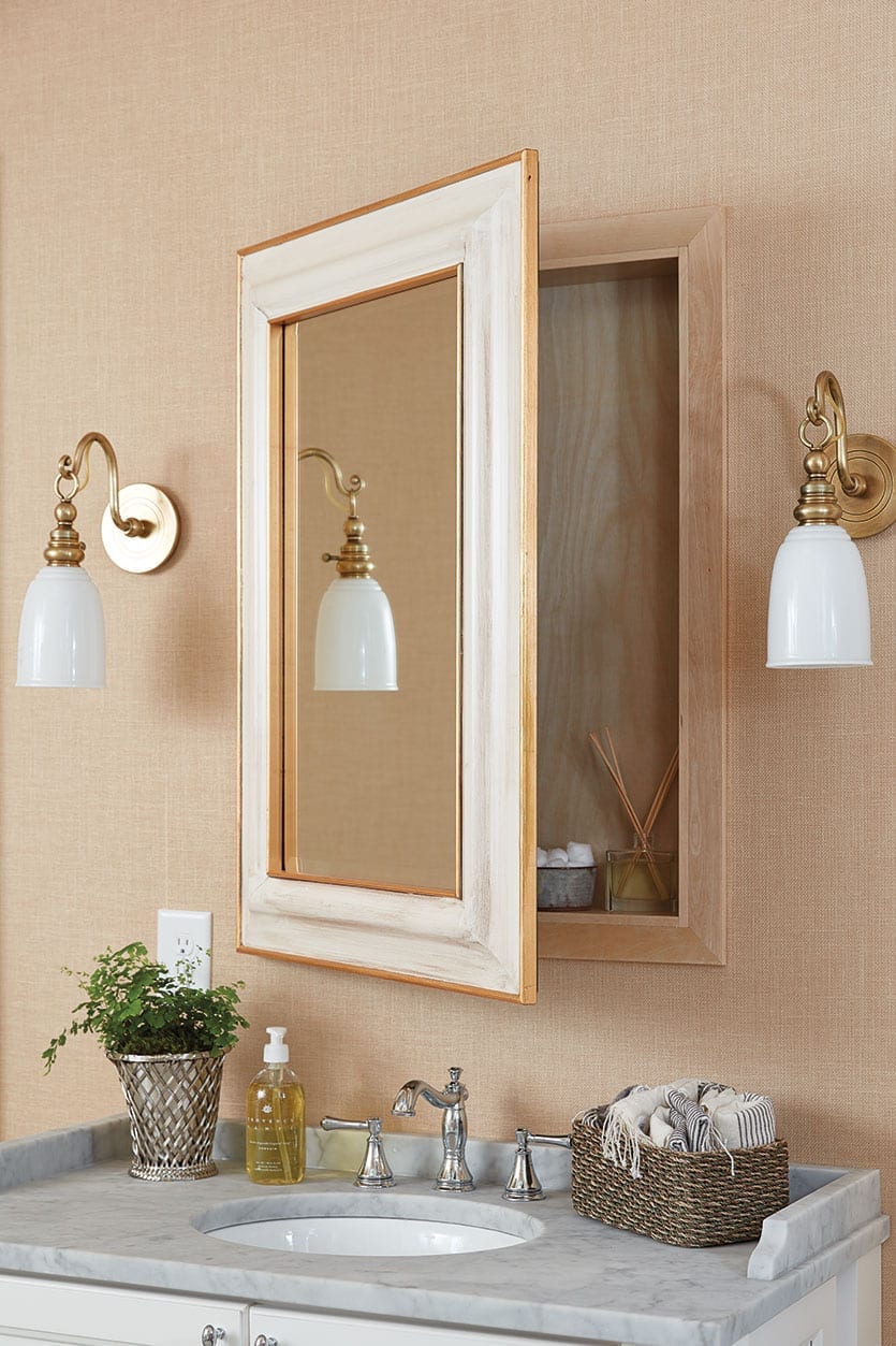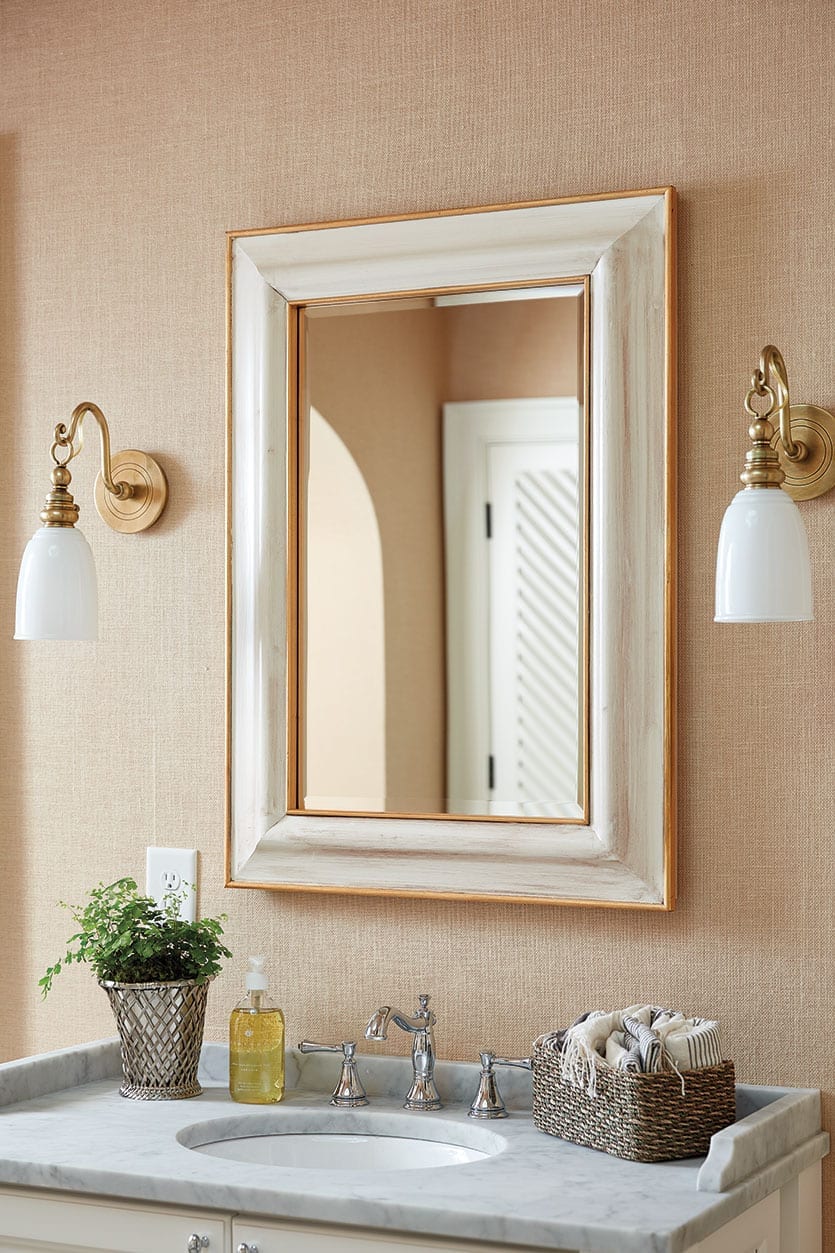 LL: We used a lot of accessories to layer and make the room feel more lived in and relaxed, such as a soft, neutral throw and pretty baskets. One of my favorite items were the mirrors from Ballard. I loved them for their scale and shape and that great gold edging. We actually retrofitted them onto a medicine cabinet. People don’t think they can buy the pretty mirror when they need a medicine cabinet for storage, but you really can.