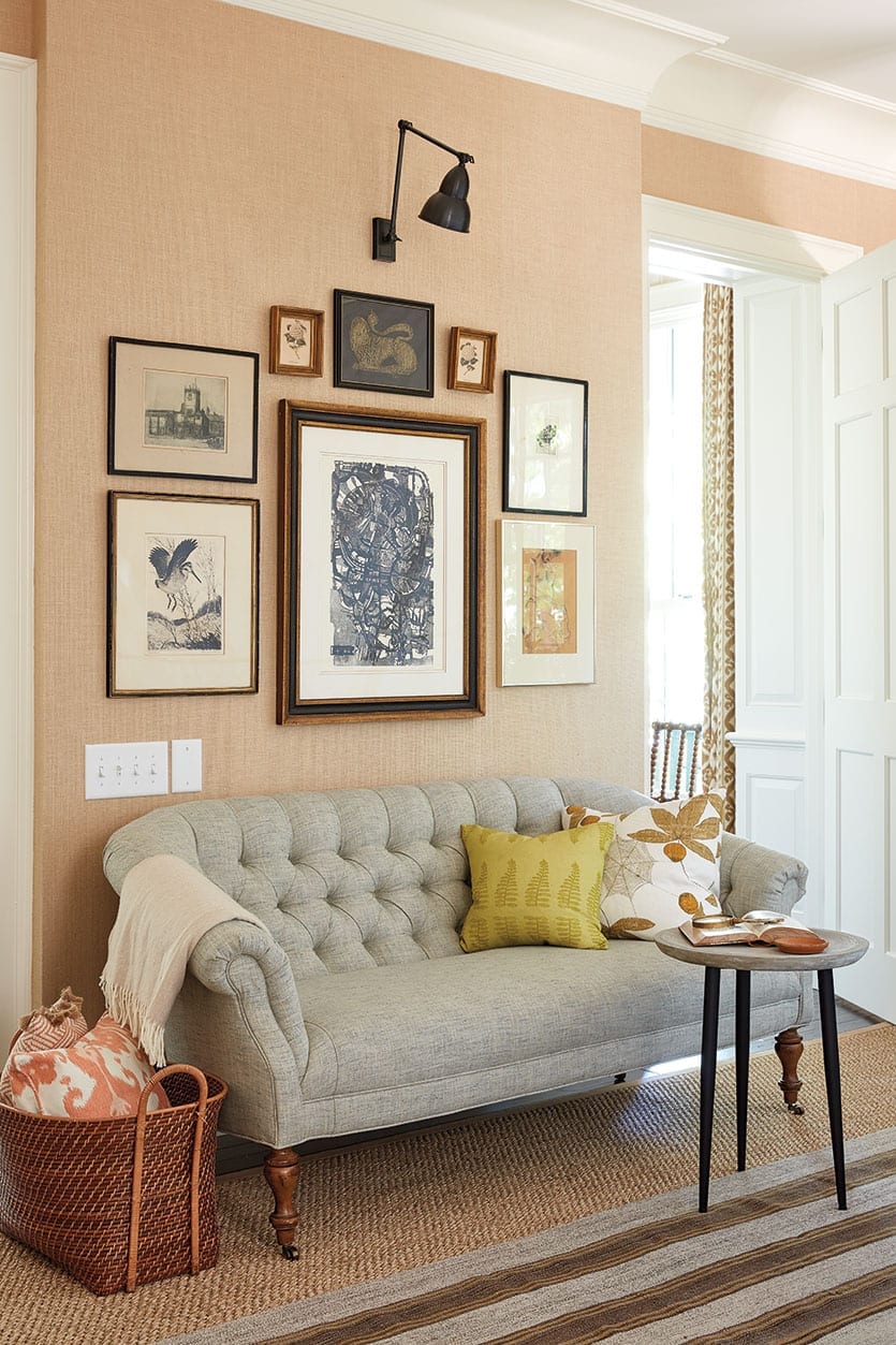 LL: I love sort of whites and naturals, blacks and ivories, so I just pulled a little more color in by riffing off that inspiration of the chartreuse, orangey brown and pale blues. I brought in a lot of my own fabrics and used them on the pillows, coverlet and canopy. I love a gallery wall, and I knew I wanted to do one. Luckily, I was able to find a lot of locally sourced artwork. One is from artist William McClure and the others I found in local antiques shops and vintage stores.