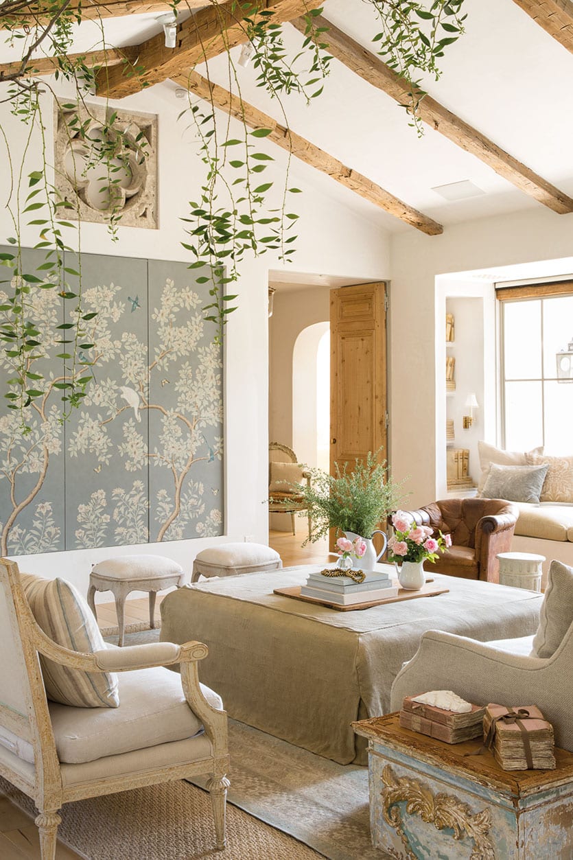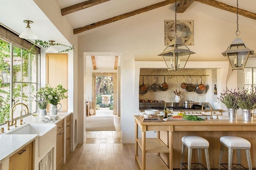 To reinforce the fluid connection between the indoor and outdoor spaces, they committed to the same natural color palette of neutrals and peaceful pastels for both. A thin layer of plaster over drywall inside mimics the stucco walls outside. Pale white oak, chalky limestone and neutral linens complement the natural tone of the stone walls. The garden palette, limited to shades of white, pink and lavender, reflect the colors used in the decor.