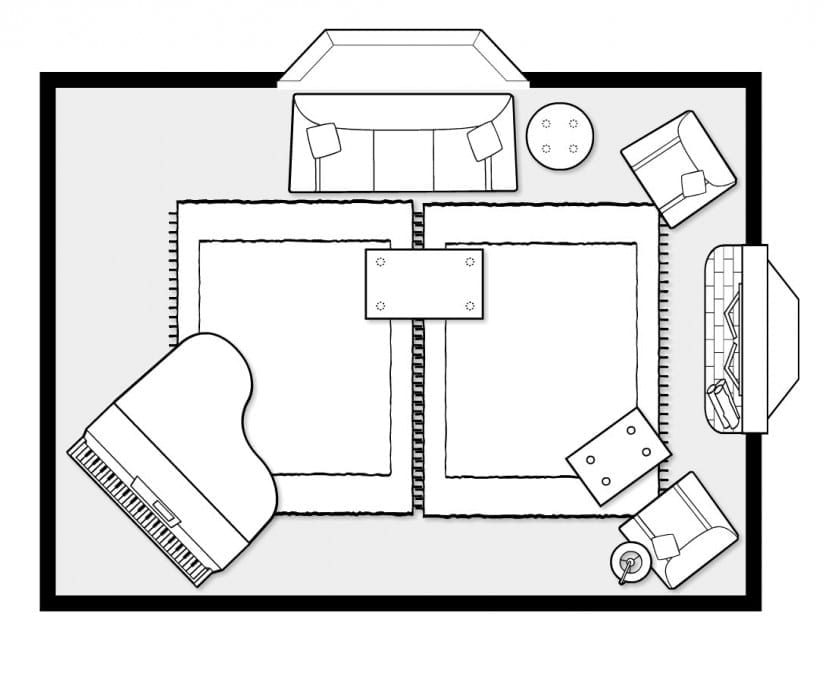Please help! We love the character of our 1920s colonial. But since we have lived here (about two years now) I can’t seem figure out how to arrange furniture in our beautiful yet super awkward living room. There are multiple challenges. There are no really no walls for furniture, the fireplace competes with the piano as the focal point, and the front door (which we really only use for guests) opens right into the room.
