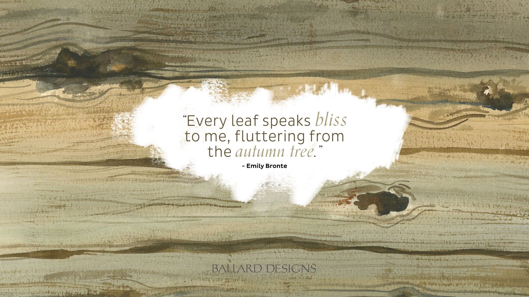 We’re prepping for Fall. Yes, yes, we hear you. It’s still 90 degrees outside, but we’ll admit to getting our Fall wardrobes ready, polishing our favorite boots, and yearning for sweaters and falling leaves. We love this quote from Emily Bronte and wanted to capture the warm ochre colors and rustic touches that remind us of fall. We hope you’ll enjoy this pretty new wallpaper.