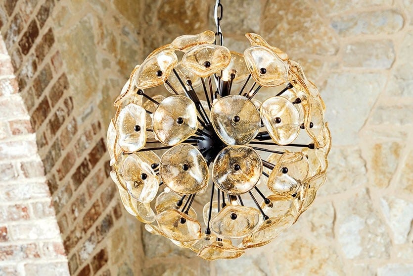 Organic, sculptural and contemporary, the Liliana Pendant sets the mood the moment you turn it on. Blooms of blown Murano glass create a bouquet of warm amber color illuminated by 12 candle bulbs hidden behind. The florettes are held in place by bronzed metal stems.