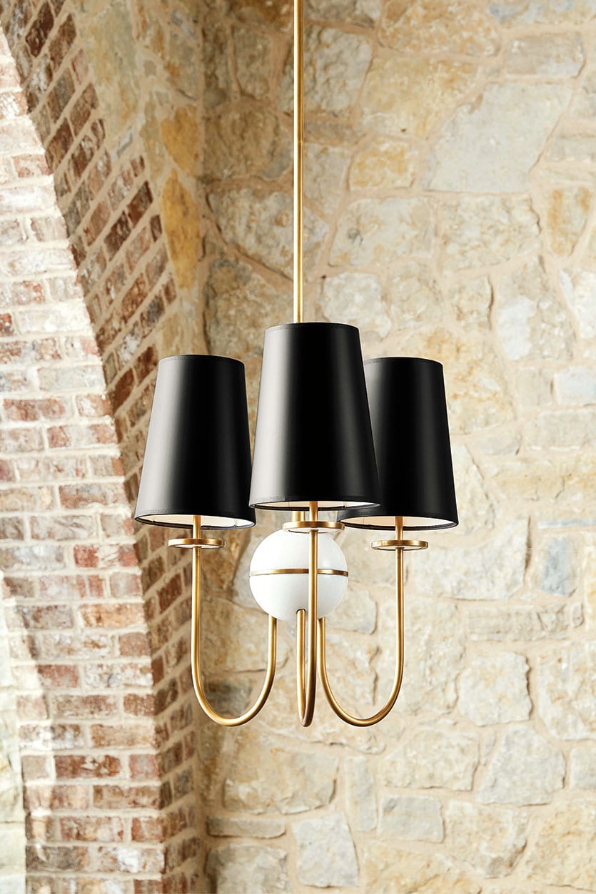 We love the Nicoli Chandelier for its sophisticated European flair. Three swan-neck arms flow from a center sphere of white alabaster banded in aged brass metal. The three elongated black paper shades with white interior add a dressy finishing touch.