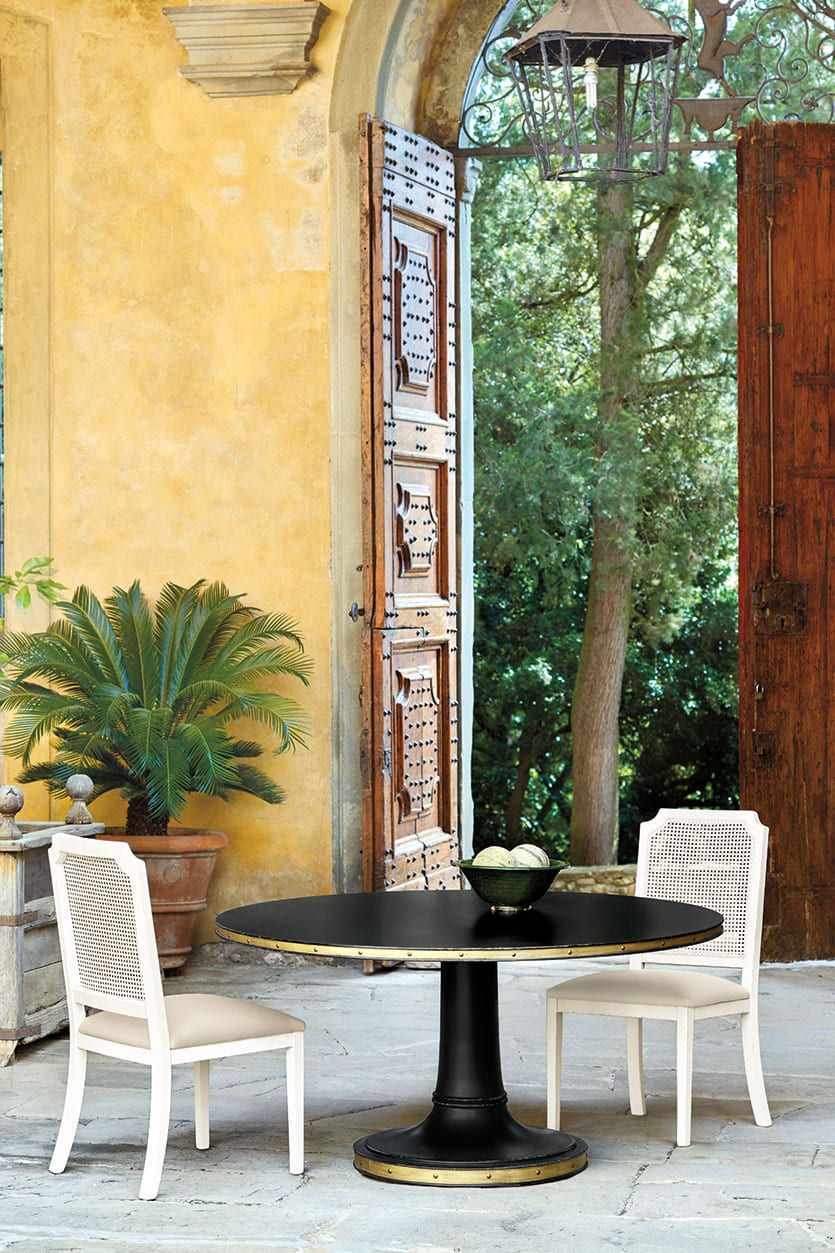 We took an iconic silhouette we’ve always loved and added vintage style for a striking statement in any room — and any finish. The defining detail of the solid wood, trumpet-style table is painted metallic banding studded with nailheads in pewter or antique gold.