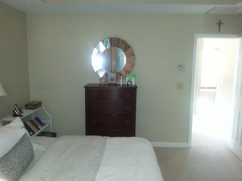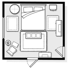 Next to the bed, the Olivia 30” Round Table will look elegant and then move the small night stand to the right of the bed. Consider relocating the book stand to another room to open up this space. Move the bench from under your window and position it at the foot of the bed. Now, the chair and small foot stool can fit nicely in the corner with the Sloan Wood Ball Floor Lamp.