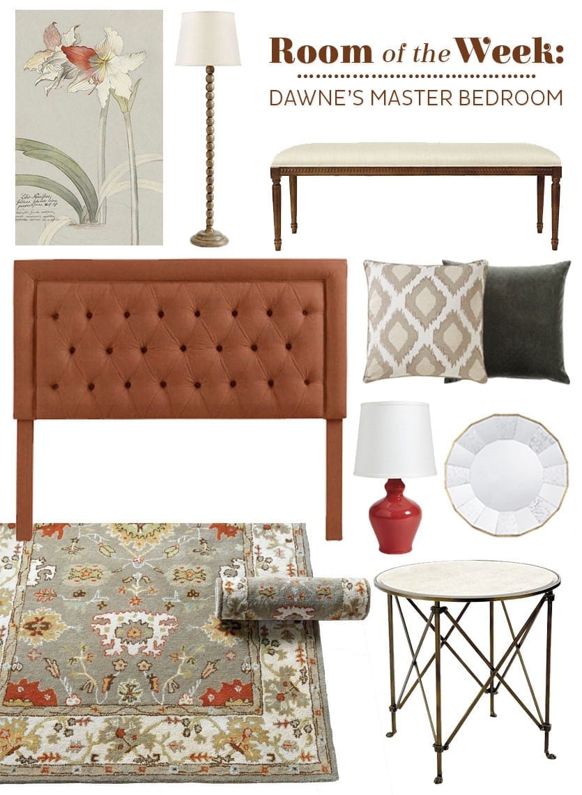 We do like the Louis Headboard in Old World Brown – as you were considering. But we think that creating a light and neutral palette in the room will make everything feel more modern. Our very first thought is to replace the drapes. If you use our Suzanne Kasler Linen Drapery Panels in Parchment, the room will begin to take on a lighter look. We like the Giselle Tufted Headboard with our Rust Linen. This headboard will set the stage for a fresh new look in the room. We love the Audree Pom Pom Bedskirt and shams. We think by adding the matching Audree Quilt and Jarden Toile Duvet and Shams in Sandalwood, you will create a beautiful and soft statement.