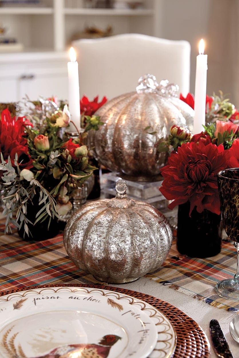 Of course once you have your table all set, it’s time to start thinking about the centerpiece. If you’re hosting lots of house guests during Thanksgiving, we love the idea of making lots of little flower arrangements for your table, then moving them to your guest room and powder room after dinner is over. We grouped together mercury glass pumpkins, tapered candles, and 3 small flower arrangements in the center of the table to create a pretty centerpiece.