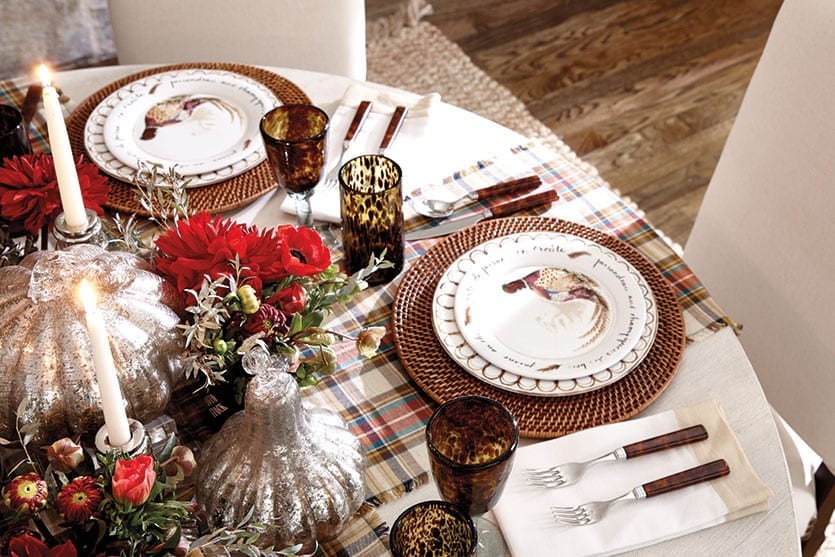 Our inspiration for the table was our new Pheasant Accent Plates. The hand painted bird on the accent plates has all of the most beautiful fall colors and works perfectly with our Harvest Plaid Table Runner and napkins. To coordinate, we chose the Chocolate Lattice dinner plate from Bunny Williams’ Melange Collection and our Piper Woven Chargers.