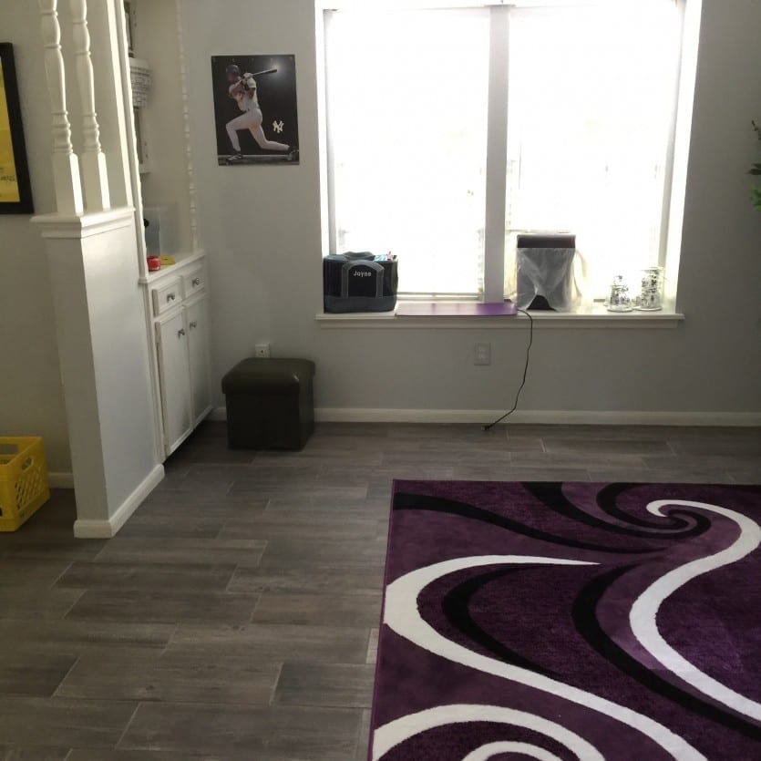 I have an accent wall in the main family room (not pictured here) that is SW Soulmate so I was trying to bring some purple into these rooms as well. The accent wall in the former dining room is SW Storm Cloud and the rest of the living areas is SW Nebulous White.