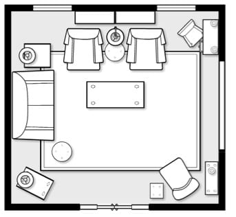 Let’s jump right in and start with your floor plan. That is one of the foundations of any great room. You had indicated that you wanted the space to be welcoming and inviting when viewing from the foyer. We have set the room with, not one, but two very inviting focal areas!