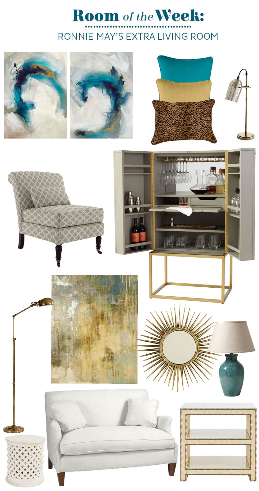 In the center of the wall we have placed your existing sofa, which is much like our Hudson Settee, with your own white garden stool as an accent table to the front right of your sofa to place a drink. We have centered the Paris Mist Art on the wall, behind the sofa, to bring more opportunities for color into the room. Speaking to that idea, we added a 12 x 20″ pillow in Safari Brown Animal Print, an 18” pillow in the Soho Peacock and a 22” pillow in the Butter Twill fabric. Next to your settee we have selected the Chloe Side Table for its clean lines and great nail heads. It is the perfect table for book storage and adds another little piece of fun to your room. On top we are suggesting the Luciana Table lamp in distressed blue and behind the lamp we have hung the Suzanne Kasler Sunburst Mirror #4.