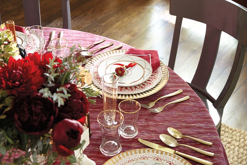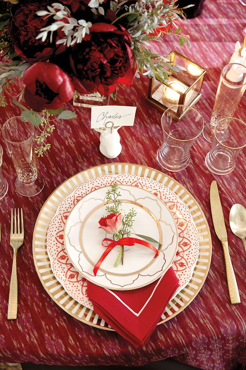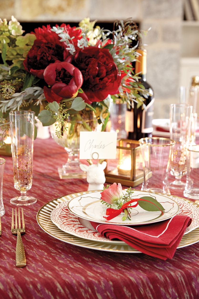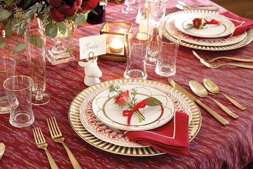 Mixing dinnerware collections is the perfect way to give those holiday pieces you pull out each year a fresh new look. We used our red Jacqueline Dinner Plates with our Florence Chargers and topped with salad plates from Bunny Williams Gold Star Collection.