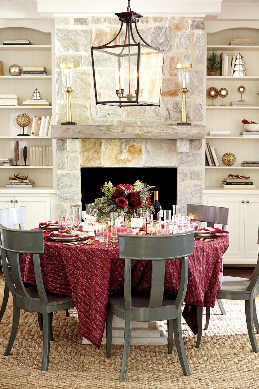 Our inspiration for this holiday table began with Bunny Williams new Thai Ikat Tablecloth. The rich wine color is perfect for this time of year, but it can easily be brought out in the summer and mixed with brighter hues. We love the way it pairs with classic Christmas red.