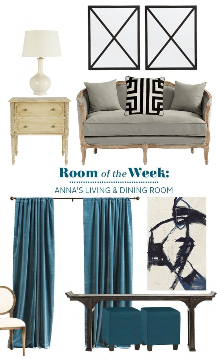 We love the color story you have going. It’s on-point with the jewel tones that are so popular this season. To blend your two spaces, we’re going to pull a little gray into the living room, and a little more teal into the dining room. Using a touch of black in each space will result in a cohesive look.