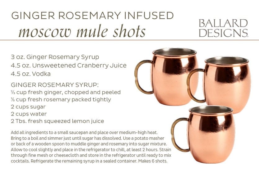 We updated a classic Moscow Mule cocktail with a little rosemary for a woody flavor that’s perfect for this time of year. Make a batch in advance and serve them in these precious shot glasses for some festive fun!