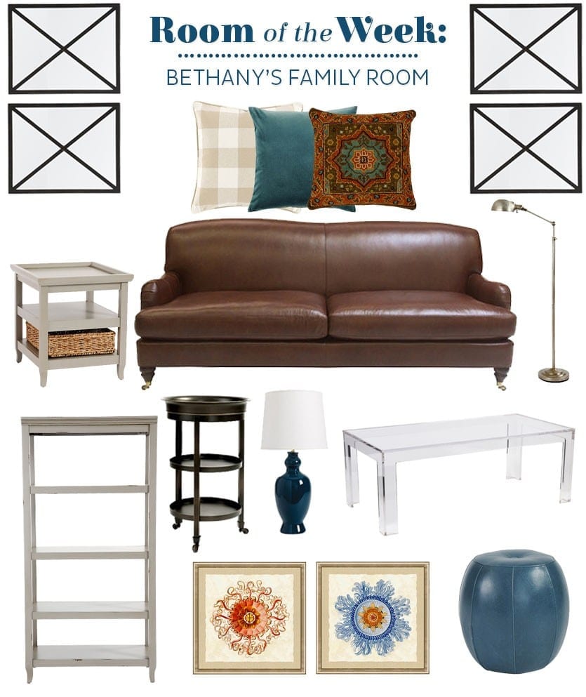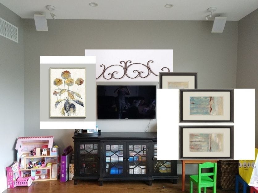 We have a family room directly connected to kitchen and counter island eating area. We have a flat screen TV on the wall and nothing else, so it is a giant bare 12 foot wall. The other walls are taken up by double sliding doors, a window, or the kitchen, so the TV wall is our main foal point for adding interest. We really need some personality through art, decor, and accessories to tie the room together.