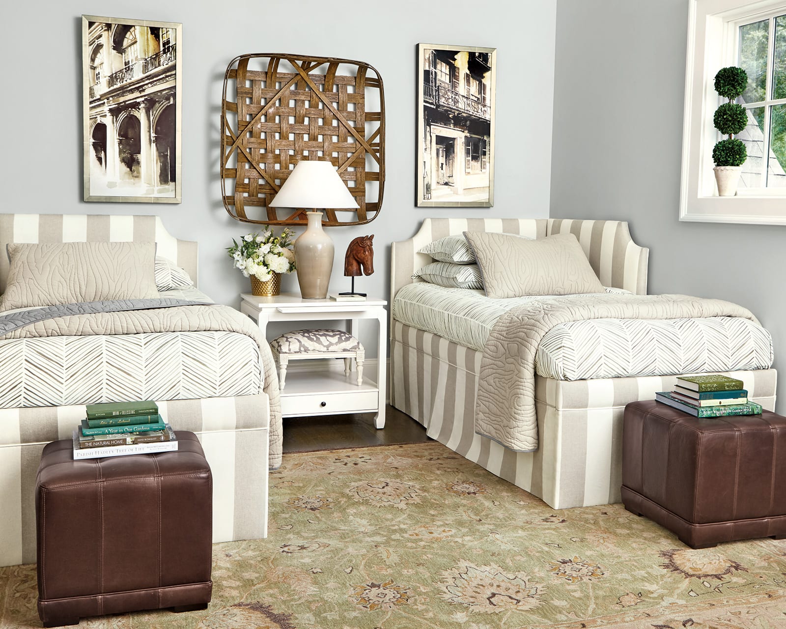 Large scale patterned fabrics with florals are another great jumping off point for decorating a blank room. This year, we’re loving our Kennedy Stone Fabric for its neutral palette and repeating, chic design.