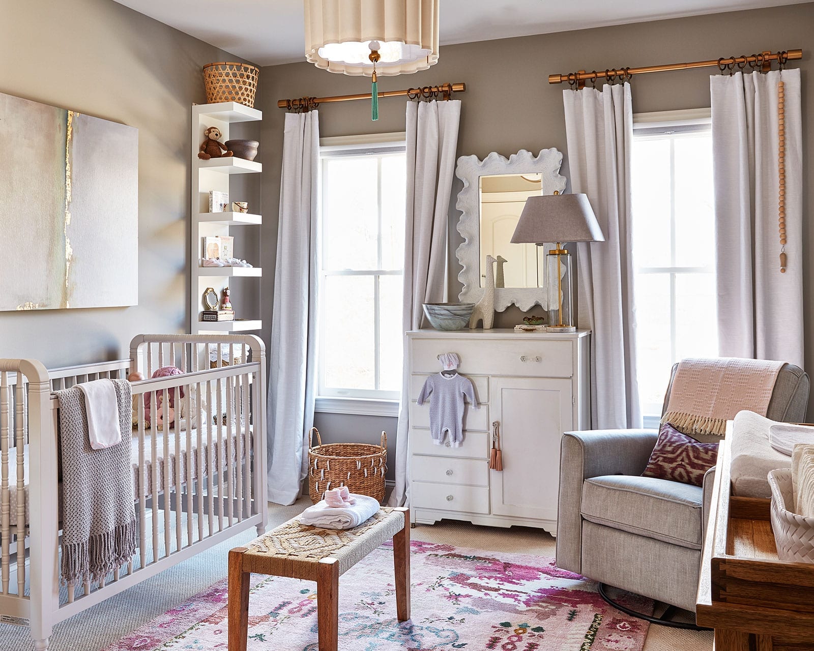 For baby girl Camille’s room, I found the rug at first and built from there. I wanted a little bit more of a pop of color but kept the rest of the room neutral.