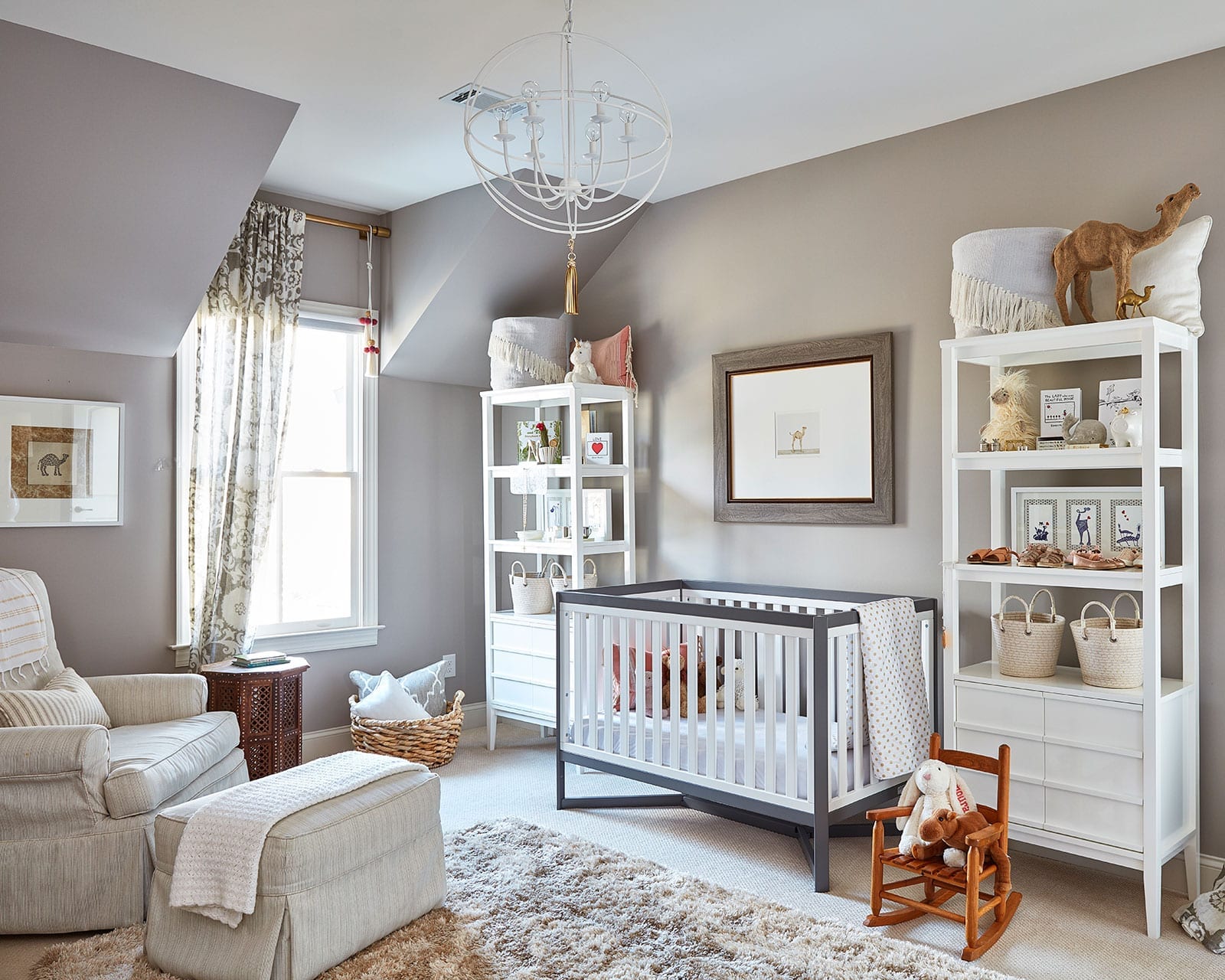 NN: I wanted Noura’s nursery to be very calm and serene. I started with the gold shag rug and the two white bookcases on either side of her crib. From there I built around it, picking the neutral slipcovered fabric on the rocker and ottoman. I wanted to keep it to gray, white, and golds. As she grows up, I know she’ll have more of an opinion about her room, so all of these neutral pieces can carry forward!
