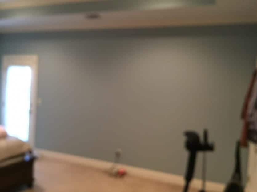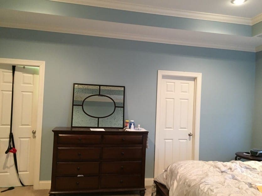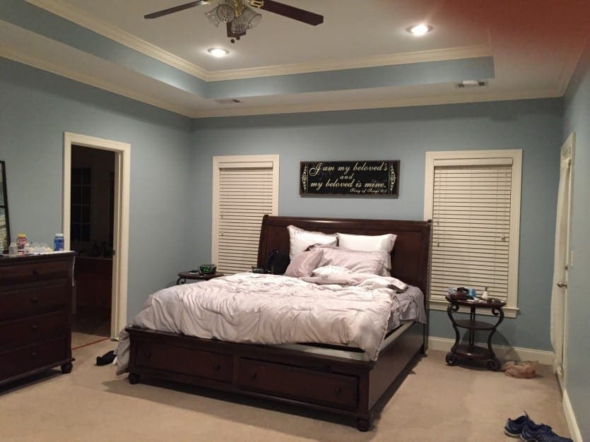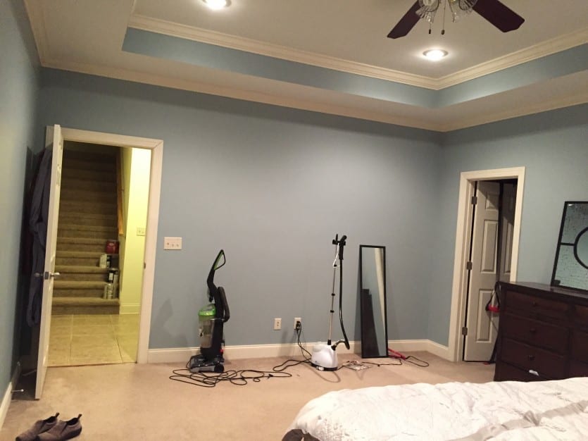 We have a large, bare, empty bedroom with a lot of brown! We painted the walls wedge wood grey to bring in some color, but now we’re stuck! How do we fill up all this space?! We will need to keep our bed and dresser. If we can make use of the mirror that would be awesome.