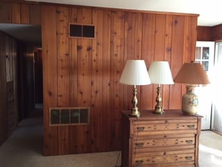 It has 3 bedrooms and 2 baths, family room, game room, kitchen, and dining area. It’s basically a blank canvas. The kitchen, eating area, and family room have knotty pine walls of the original medium stain. I have read many of your blogs, which have given very good advice, and have thought about introducing mirrors and small crystal sconces to the knotty pine walls. Other than that, I don’t know where to go.