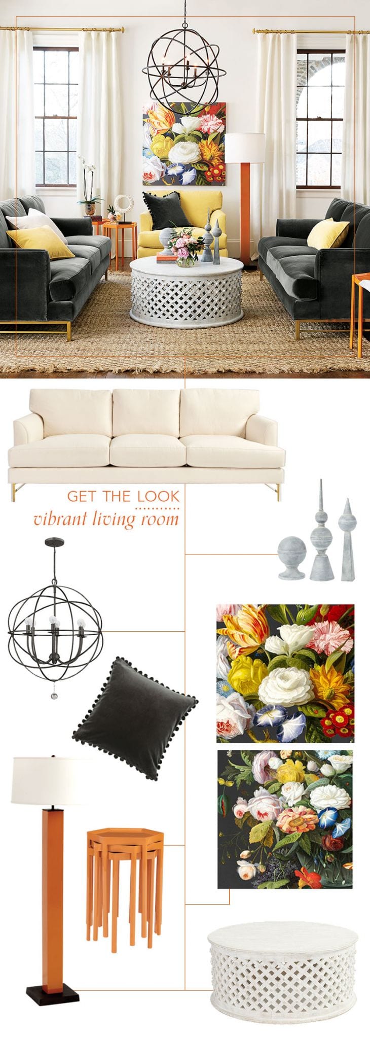 Spring is a magical time when nature starts to bloom with color, so it’s no surprise that for Spring 2017, we’re letting color wake up our neutral rooms. We took the lead from our Opulence Art which is grounded in charcoal gray and upholstered a pair of our new Kathryn Sofas in a charcoal velvet. Then, we let the art and accessories take center stage by using bold oranges and yellows.