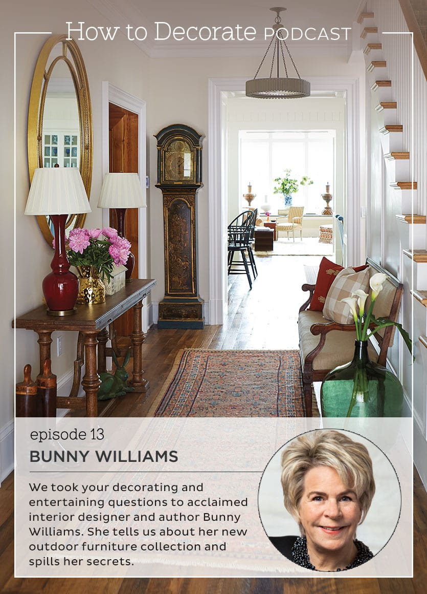 Hold onto your earbuds because our guest today is none other than our own design partner, author, acclaimed interior designer, and hostess extraordinaire Bunny Williams! We traveled to Bunny’s office in New York to record this special episode in her office, and she definitely did not disappoint. Bunny shares some incredible decorating tips and stories, including how she furnished her first apartment and decorating her home in the Dominican Republic. We talk about her new outdoor furniture collection La Colina, and of course she answers your decorating questions!