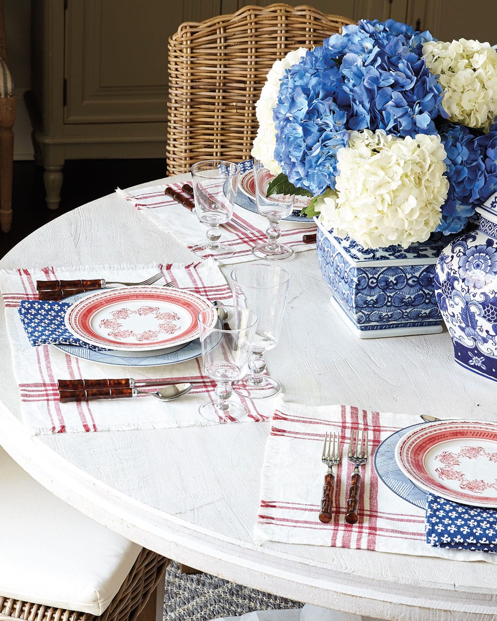 Each piece of our Jacqueline Collection features a different pattern, like you collected them all at a flea market. The medallions in the center of the salad plates remind us or fireworks, so we wanted to pull together a summer inspired table in red, white, and blue, perfect for your summer holiday celebration. To balance the organic, whimsical design of the Jacqueline salad plate, we used the dinner plate from Bunny Williams’ Campbell House collection which has straight, geometric lines.