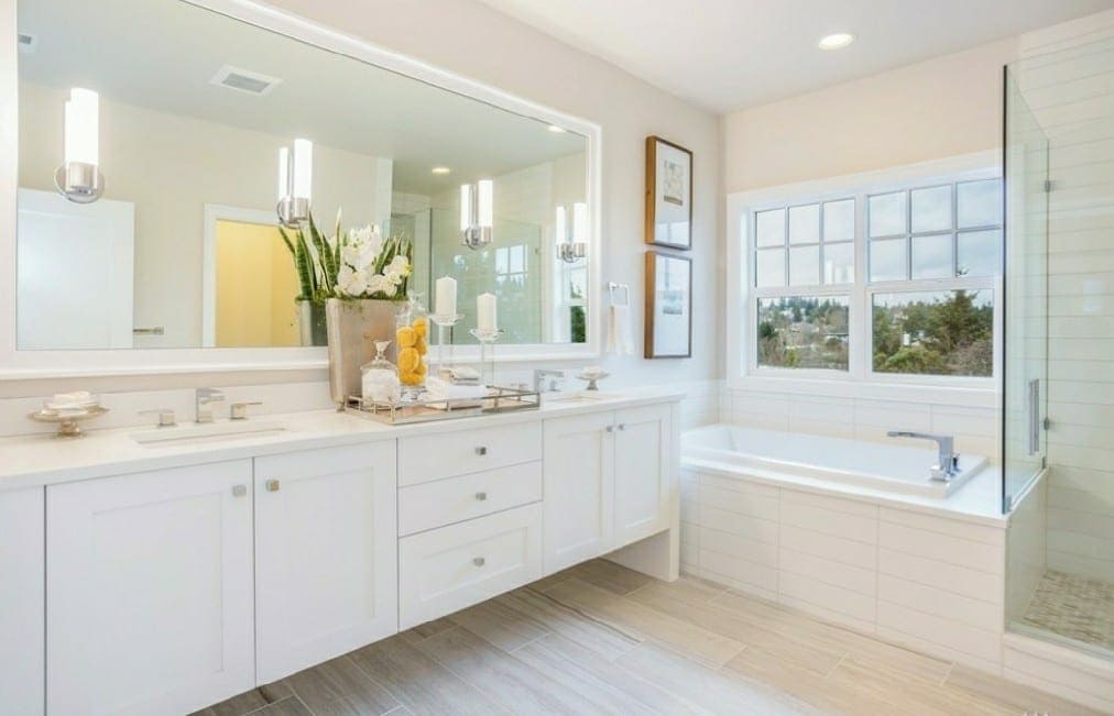 My dilemma is—we need window treatments and with 39 windows, with most of those being 2-3 panes wide, it has me a bit overwhelmed. I feel that white 3-4 inch plantation shutters would look great in the house and compliment its lines and overall style. Along with the shutters maybe some Hunter Douglas pirouett blinds on the main floor and master bedroom, and then blackout cellular shades in the kids bedrooms. My problems are, since we are higher up, privacy is really only an issue in the lower parts of the windows with the upper parts mostly having nice territorial views of evergreens and in the master bedroom a peek-a-boo view of a lake. I hate to cover the upper view just to get the privacy for the lower half but I don’t love the look of cellular shades on the main floors… but the top down/ bottom up feature is great. I am thinking about doing cafe style shutters in a few areas.. but haven’t really seen these in person and am wondering if they look ok or if they just look unfinished? I am also a little afraid of losing a lot of light if I do all full shutters with a divider bar so I can block out more of the bottom portion while leaving the uppers open. We had white 2 inch shutters in our old house also mixed with the pirouetts and loved them… but here there would be a lot more of the shutters. So questions… how do you all feel about cafe shutters? Do you think cafe shutters on bottom with very tailored romans on top would look ok? What do they think of doing full shutters with the divider bars? Do you have any other thoughts and or advise for this project? Sorry for the long drawn out question… Thanks for your time and any input!!