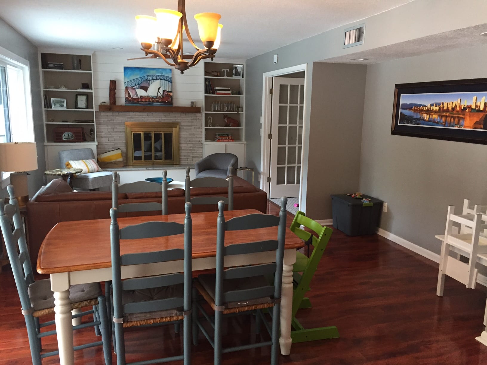 Consider placing a large buffet or console in the niche by your dining table. This will be a great vehicle for a pair of lamps and can also hold the kids toys you currently have in a bin. You definitely need more ambient lighting — a couple of floor lamps, some table lamps, and maybe a new light fixture.