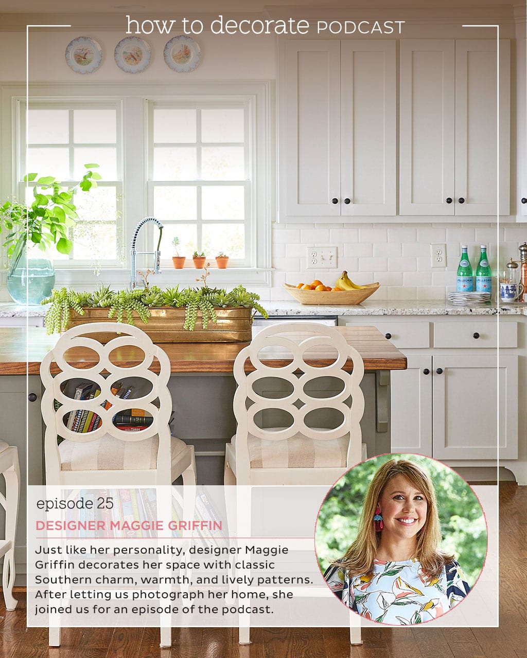 Interior designer Maggie Griffin from Gainesville, Georgia decorates spaces much like her personality, warm, happy, and with classic Southern charm. We loved touring her house and couldn’t resist the opportunity to get her on the podcast. If you aren’t yet following her on Instagram, then you’re gonna want to start. We talk about decorating with kids, how to build a gallery wall, the deal with decorating around the TV, and other decorating ‘don’ts’ like ceiling fans.