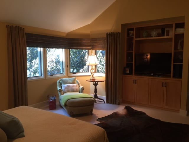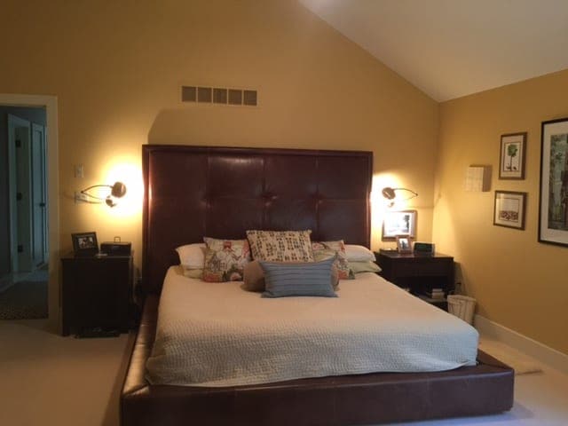 I have enjoyed listening to your podcast and am hoping you can help with a decorating problem I have had for some time. As you can see from the attached photos, we have a king size tufted leather headboard in our bedroom with a cathedral ceiling. Unfortunately we have an off center air register above the bed. We cannot move it and need the air ventilation. What can I do to make the space interesting. I am an eclectic person and have enclosed a photo of the rest of the bedroom so you can see.