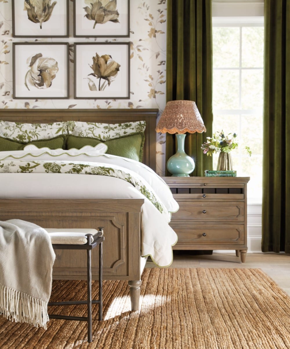 Once you’ve dressed your windows and picked out just the right headboard, bring in all of the details. Like we said, make the bed placement look intentional, and adding in all the finishing touches will do just that. Dot the room with designer details like a scalloped lamp shade, chic nightstands, and a hand woven rug to bring everything together.