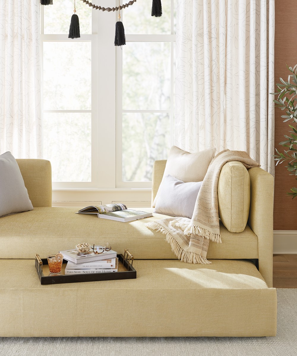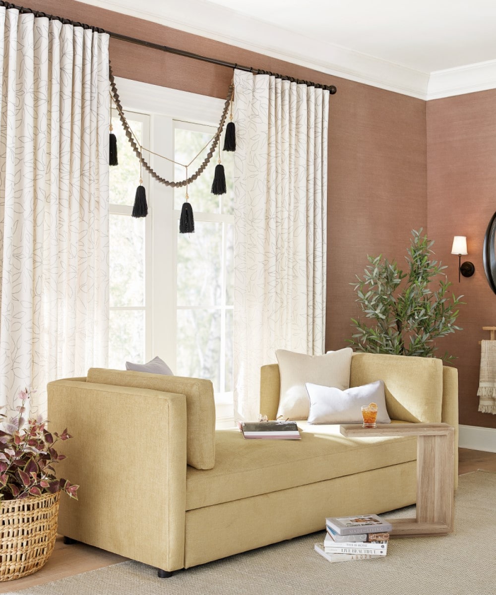 If you’re considering placing a bed in front of a window, your main goal is to make it look intentional and interesting. In this space, we sprinkled in some eye candy with two textured garlands. To bring even more personality to your room, pair the tassels and beads with an unexpected color or print. We love how the yellow daybed and organic leaf print drapery panels makes the room feel inviting and happy.