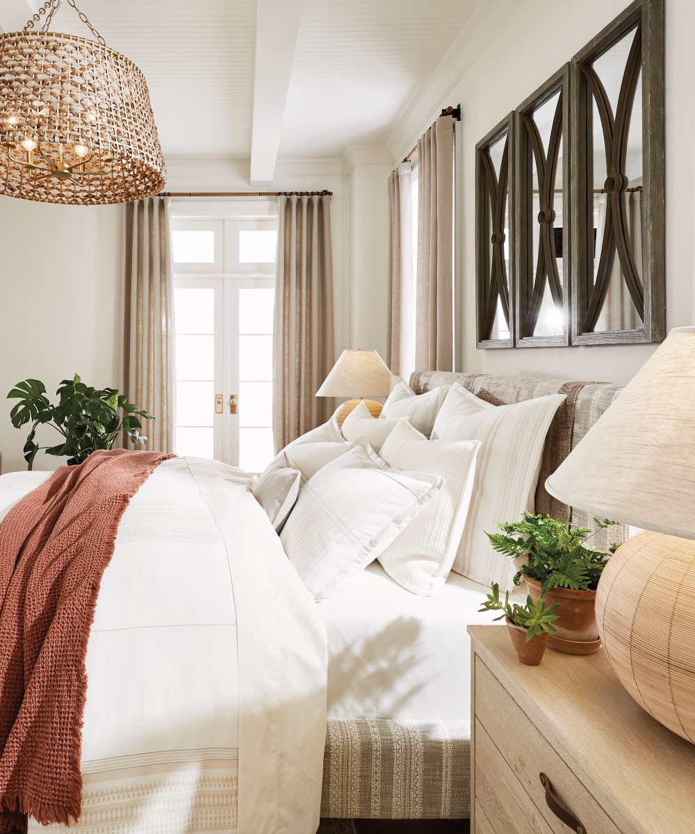 If you want to embrace your room’s gorgeous natural light, use a bed frame that’s open rather than an upholstered one, and keep pillow stacks low. In the room above, we also used sheer drapery panels so the light can stream in. The mix of open furniture and translucent drapery creates a room that feels bright and airy.