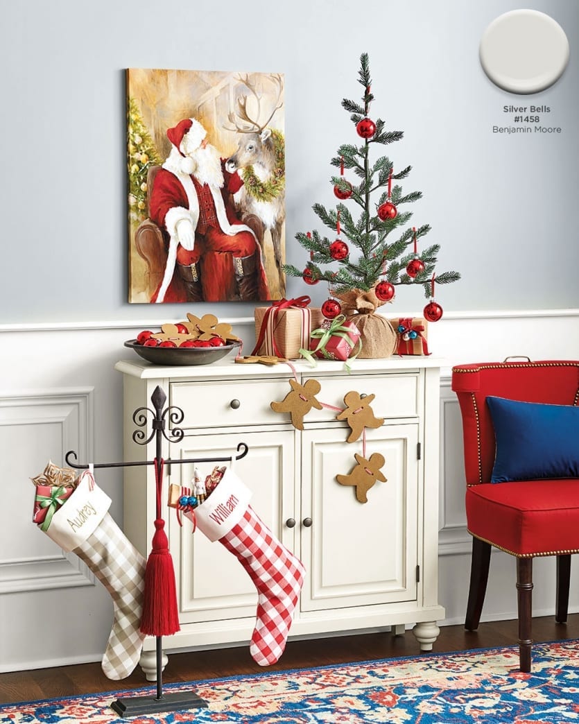 To balance the strength of Christmas red, we chose Benjamin Moore’s Silver Bells — a gray with just a tiny touch of blue. White would’ve been too strong a contrast to our red accents. Gray balances out the warm tones but still creates a fresh backdrop for a room.