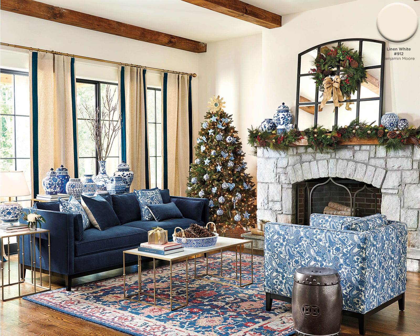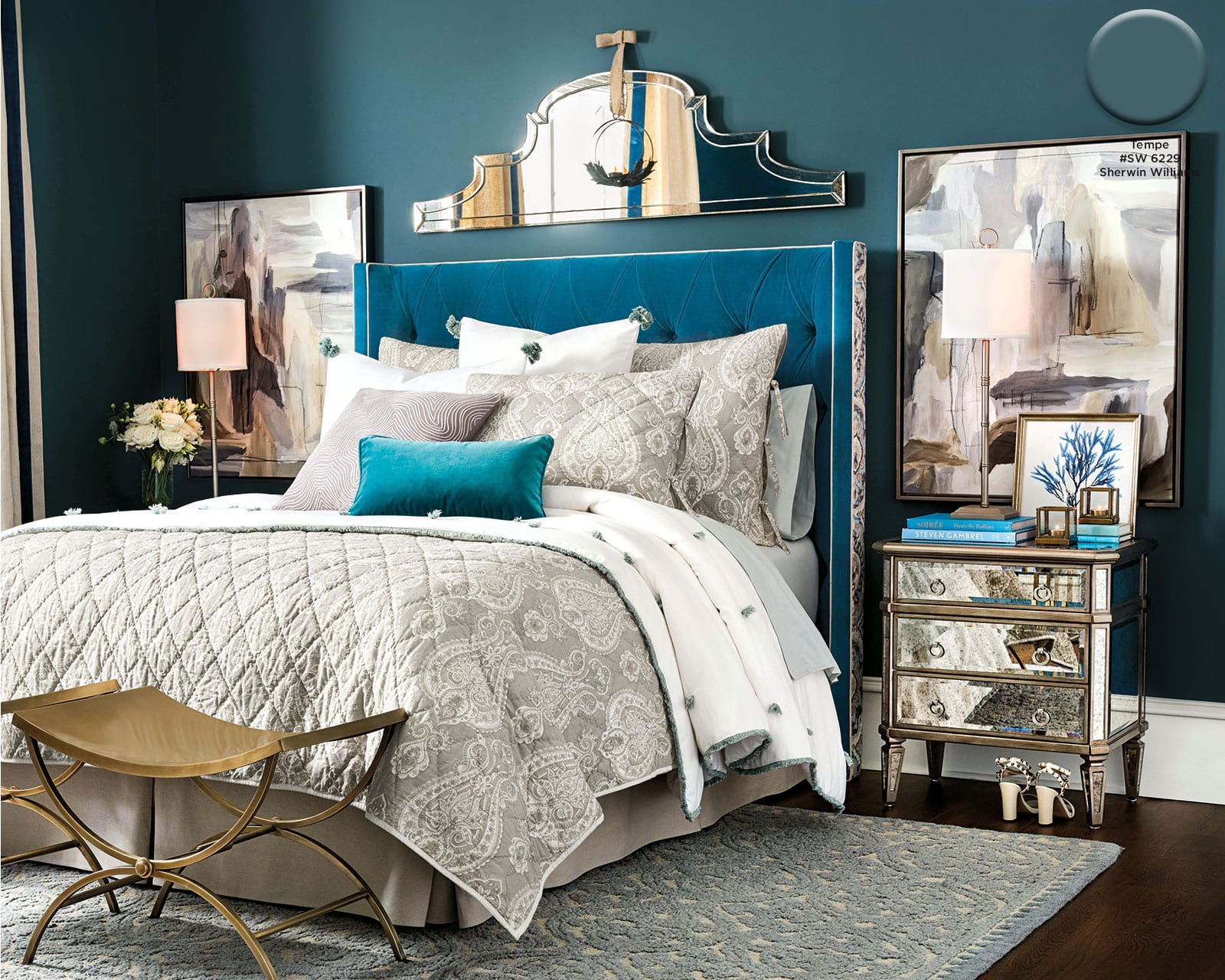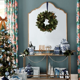 You don’t have to decorate with a sea of red and green to create a festive, holiday home. We love using blues in every shade — navy, teal, sky — as a backdrop for metallic holiday decorations. To create some drama, we chose a deep teal, Sherwin Williams’ Tempe Star. Metallics, silvers, and grays pop off this bold color and bounce around the room.