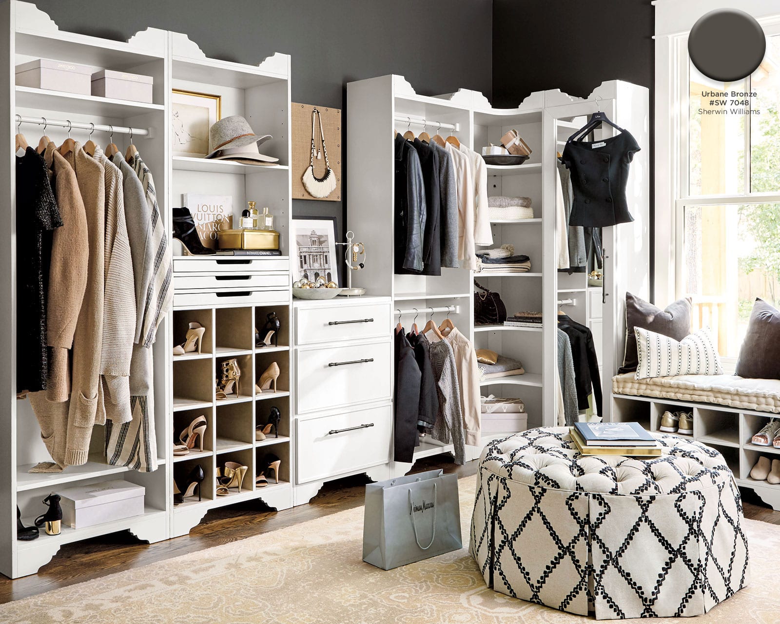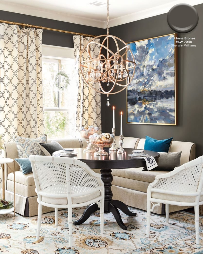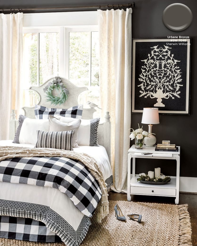 With heaping doses of white and cream, there’s no need to be scared of a deep charcoal wall color. Urban Bronze by Sherwin Williams is one of our favorites because it has a hint of brown in it — just enough to keep it from feeling to cold. It works beautifully with warm golds, creamy whites, and sandy neutrals.