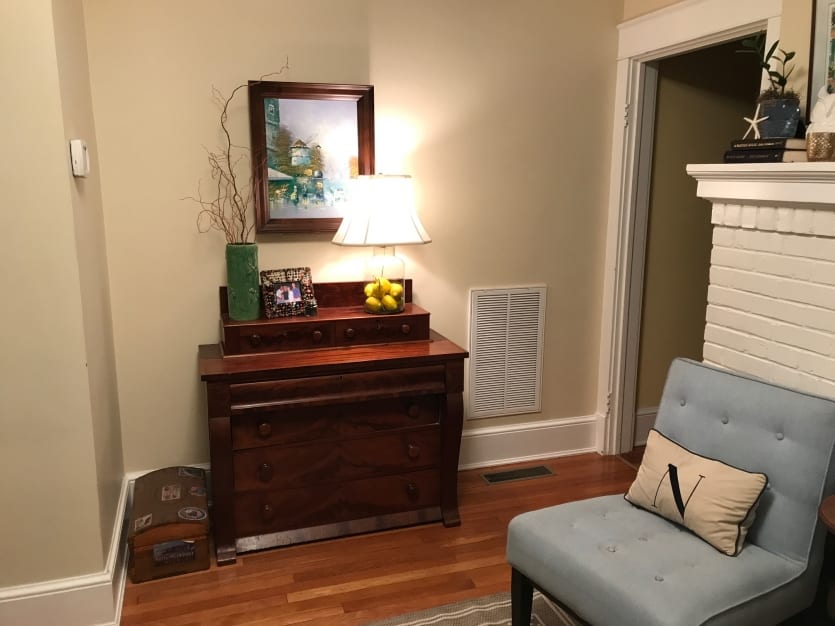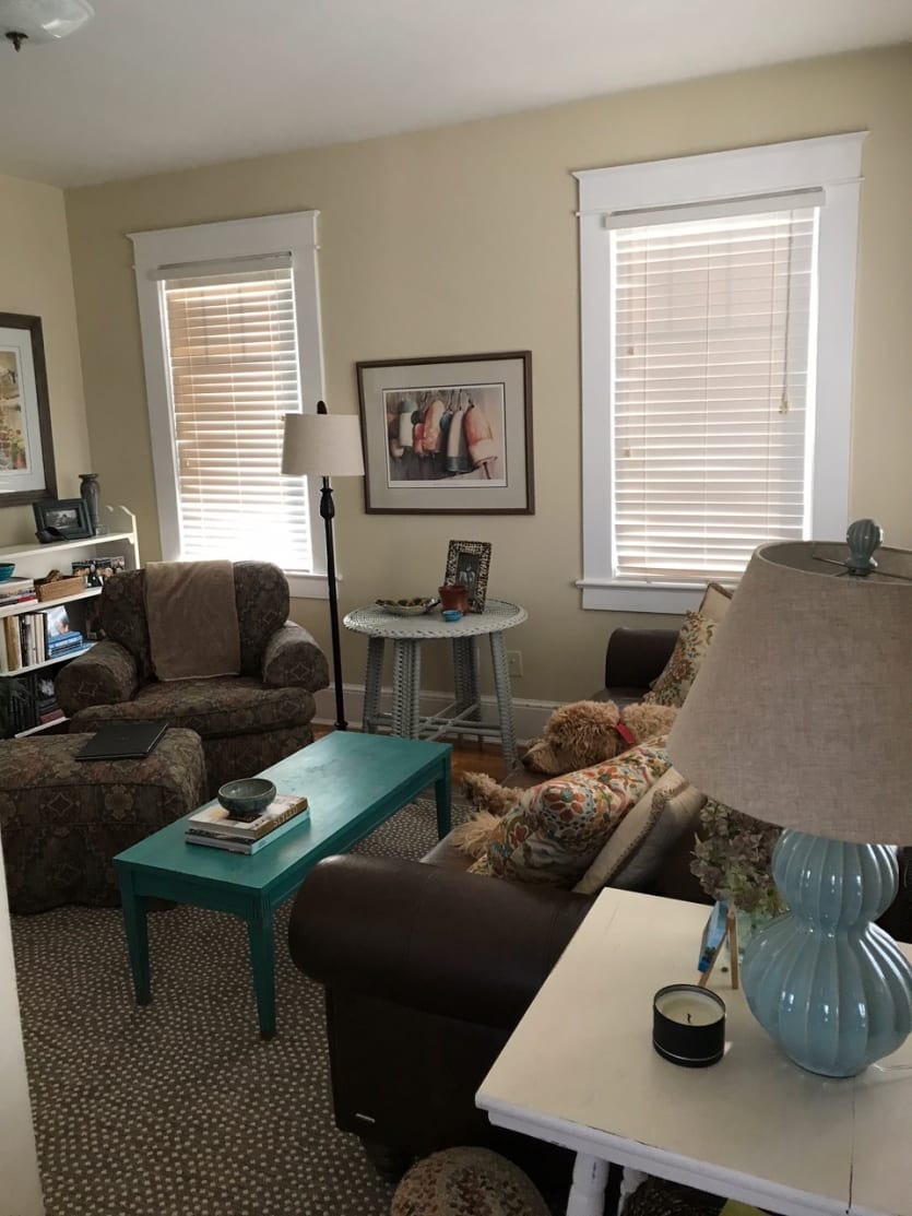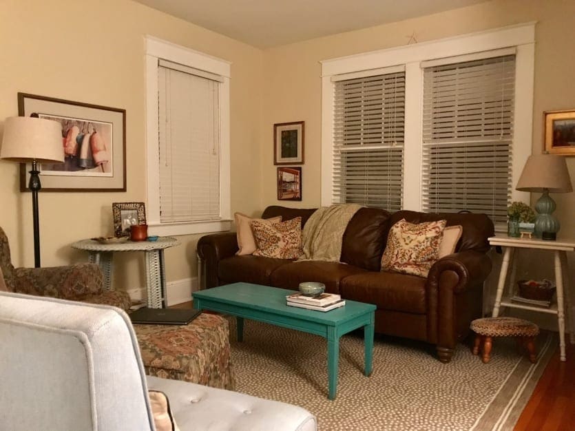 I have begged my husband to move but it’s not in the cards so instead I’m trying to zhush up what I’ve got. We live in a tiny 1930’s Dutch Colonial and my living room is awkward at best. I struggle with furniture placement and don’t have enough room to float it so can’t follow Bunny Williams advice, so it’s married to my walls. And, even though I really love color, somehow I’ve ended up with a boring beige room. Most of my pieces are family things or thrifted and I love a casual and collected look. I don’t have draperies since I think the room is too small and they would take up my wall space and I’m pretty sure my lampshades are hideous (and not the right size). So, I would love your thoughts on a few things-
