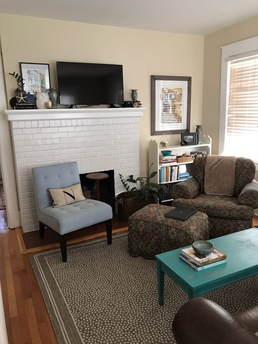 Consider the scale of your furniture. The sofa feels too big for the space. The rolled arms make it feel too big, so look for something that has a narrower arm and a cleaner line. Something in a lighter fabric that’s either off white or natural colored.