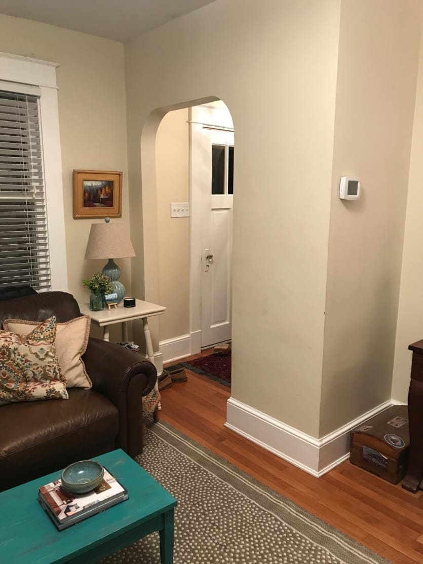 Let’s talk about the good things in this space — the mouldings, the doors, and the scale. It looks like a great old house. Start by lightening the paint color, maybe something towards the white family. Paint the trim and walls the same color, but let the walls be in an eggshell finish and a semigloss on the moulding. Add a drapery panel that’s the same color as the walls in an airy, open weave.