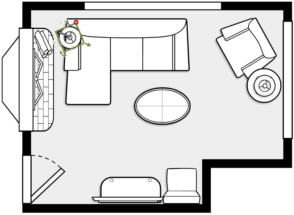 Use our room planner to play around with the layout. You may be able to even fit in a sectional with a chaise. If you rethink the pieces you have, you may be able to fit more seating into it and also take up less room. Maybe a swivel glider or a recliner that will please your teenage son and husband but will look great!
