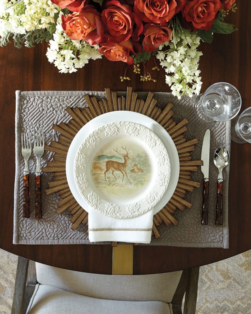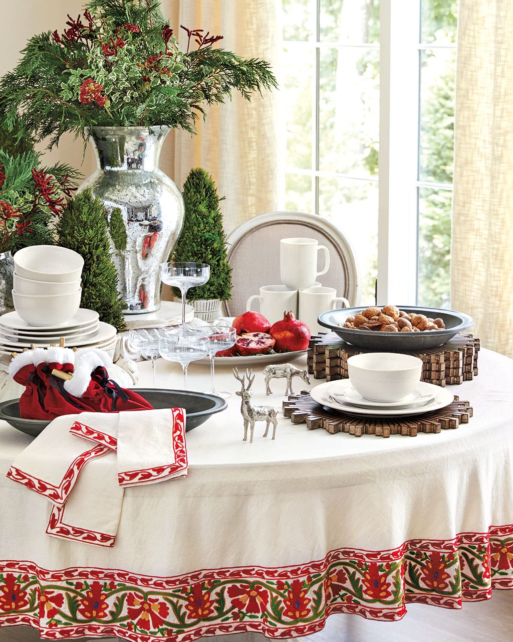 They remind me of a kind of a Scandinavian Christmas. I have my mother’s red Lenox Christmas china, so I always set a red and green table during the holidays. I love the color palette of these linens and the handmade quality to it.