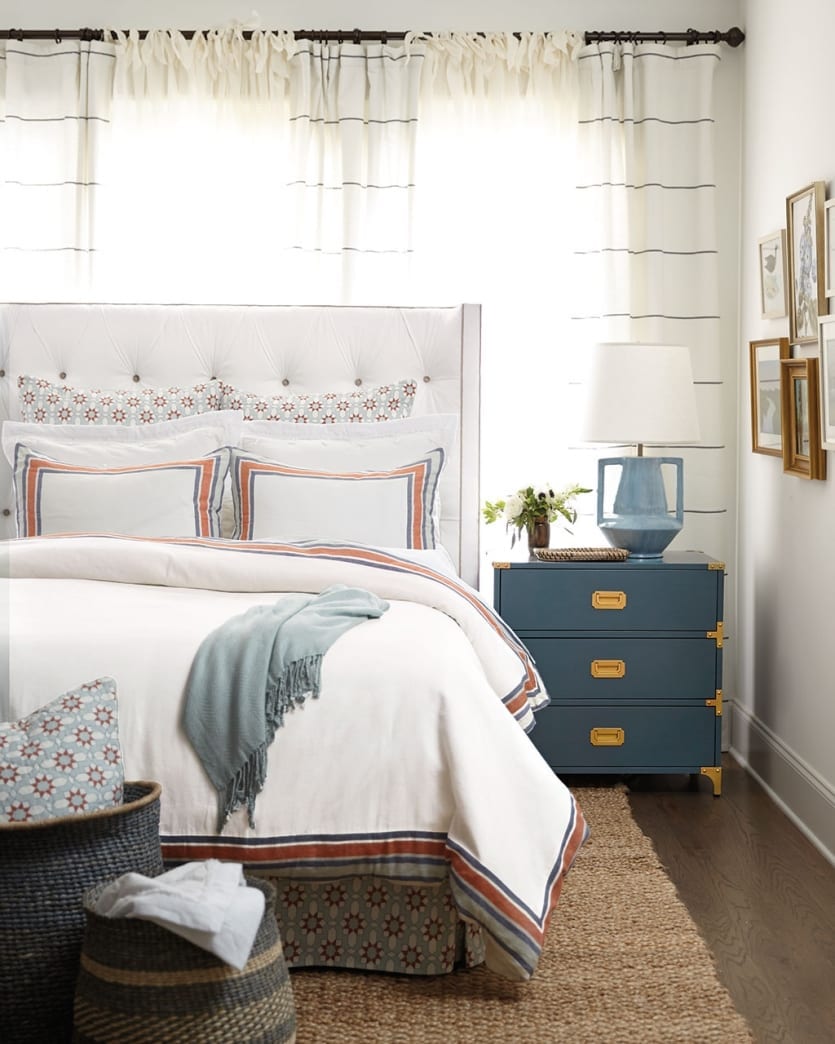 To bring color into this blue bedroom, we chose several accents in varying shades of blue. They’re all similar but none of them match exactly giving the space a more collected feel. Our Saunders Striped Bedding was the jumping off point, so we brought out the blue with our Adrian Terra Cotta Lamp and our Charlotte 3-Drawer Dresser.