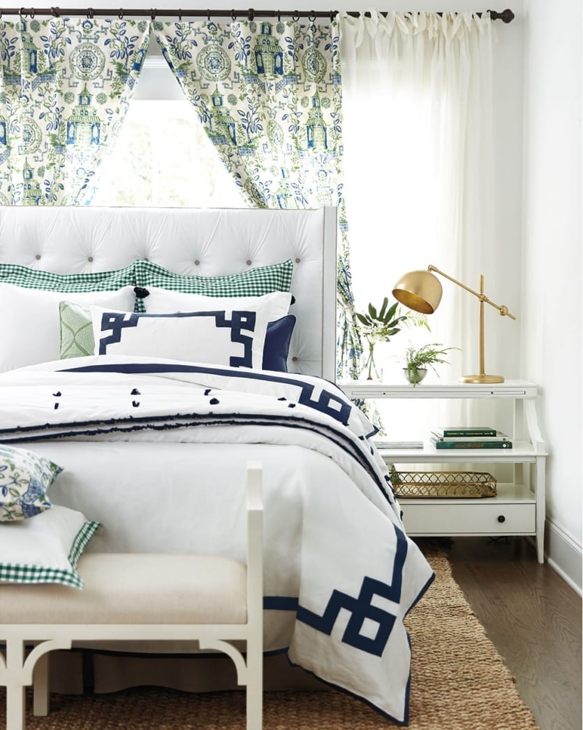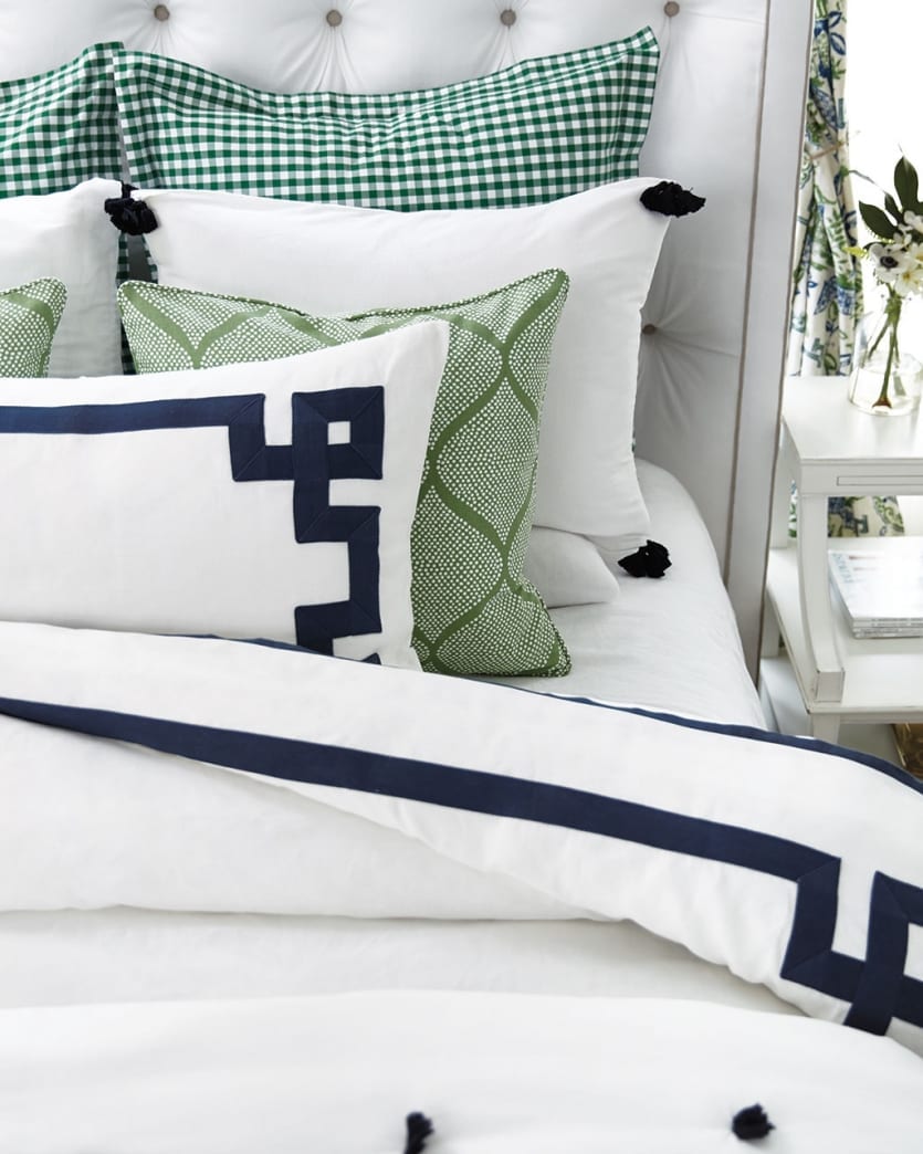 We played up our loved of classic patterns by bringing in our Ellery Gingham Bedding in Emerald. Big Euro shams provide the perfect backdrop for our navy and white accents and help blend the Pagoda fabric with our Greek Key.