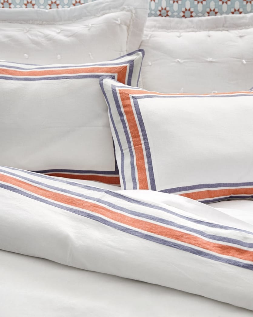 We’ve talked before about how the color wheel can help you decorate, especially when it comes to choosing a color palette. Our Estella and Saunders bedding uses a complementary color combination of blue and orange to bring life to this bedroom.