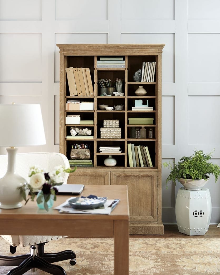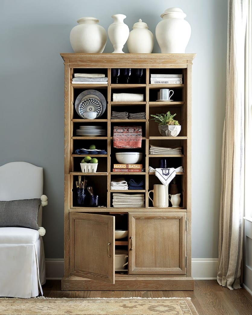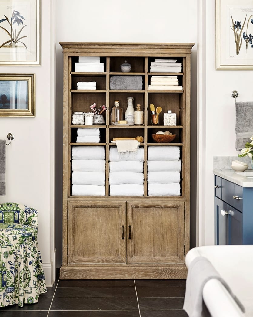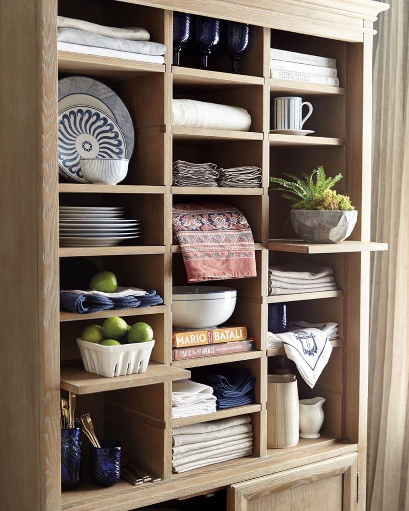 Obviously most kitchens have plenty of cabinetry, but in some cases it’s worth adding a piece in a different finish. With open and closed cabinets, Beckett efficiently stores everything from linens to cookbooks to cookware.
