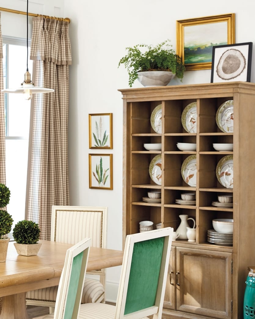 Here, we were inspired by the color palette of Bunny Williams Melange dinnerware. To coordinate we chose earthy greens, oak furniture, and taupe checked drapery panels.